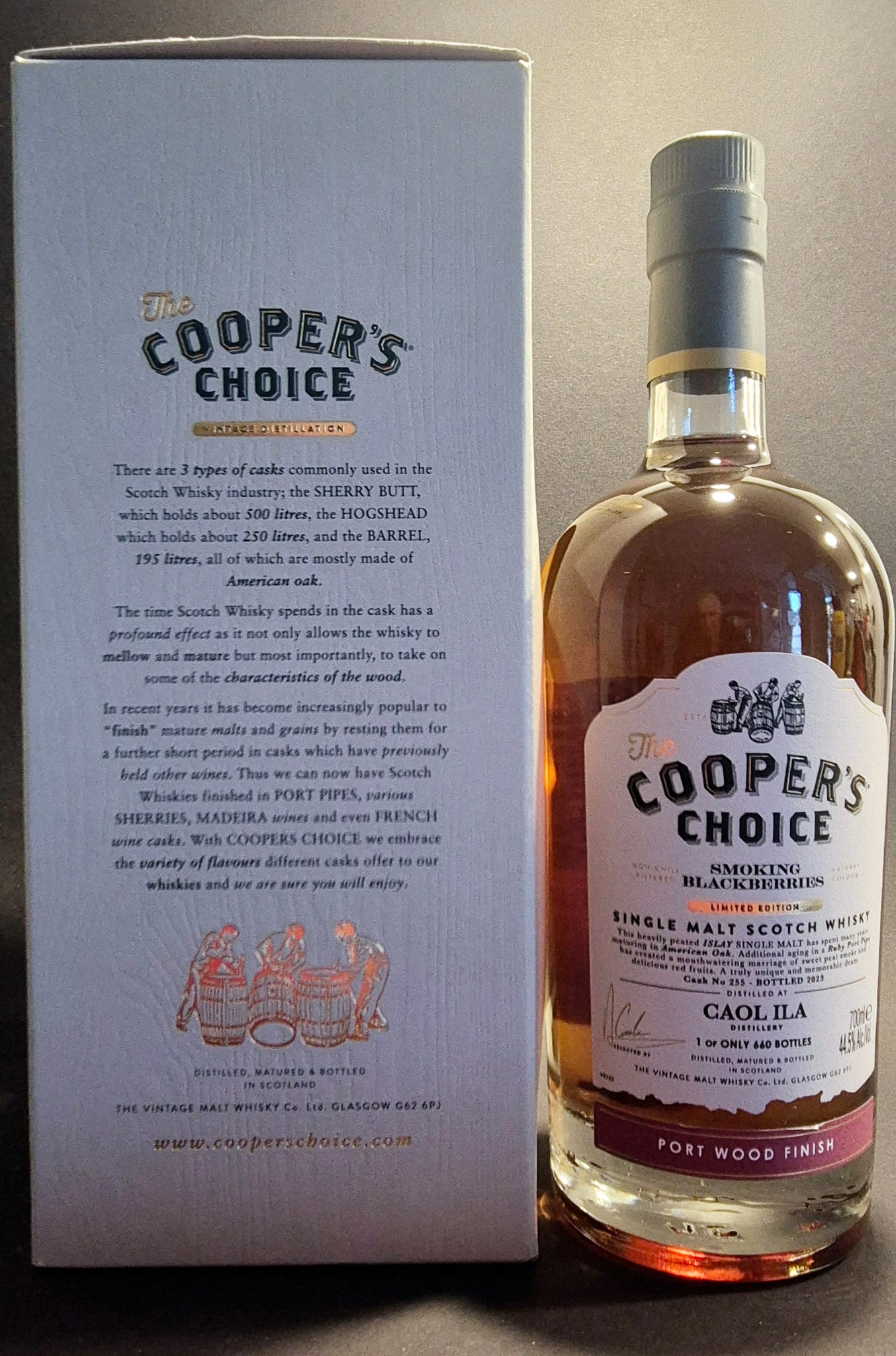 COOPER CHOICE Blackberries CAOL ILLA Port Wood Finish. Limited Edition. Abfüllung von nur 660 Flaschen Weltweit! Intensiver Geschmack von Dörrobst,Waldhonig,Vanille, süsse Waldbeeren abgerundet mit einem feinen Portwein Geschmack und einer leichten Torfnote.